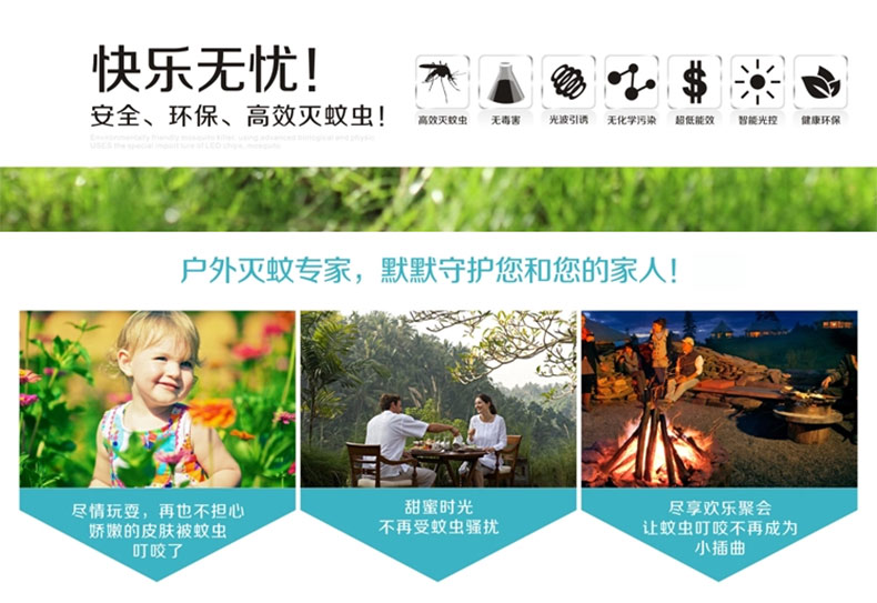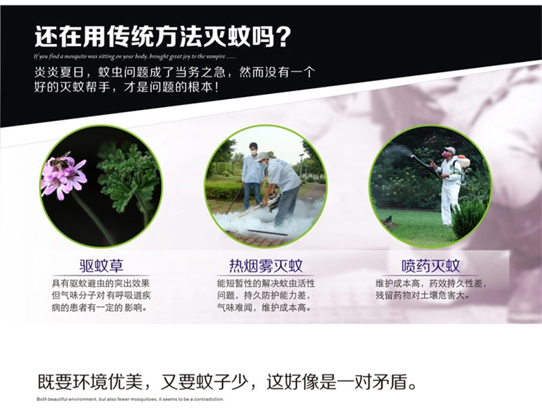 1、冷陰極燈管誘蚊效果,紫外線誘蚊,高壓電網殺蚊,物理方式滅蚊,環保無污染。