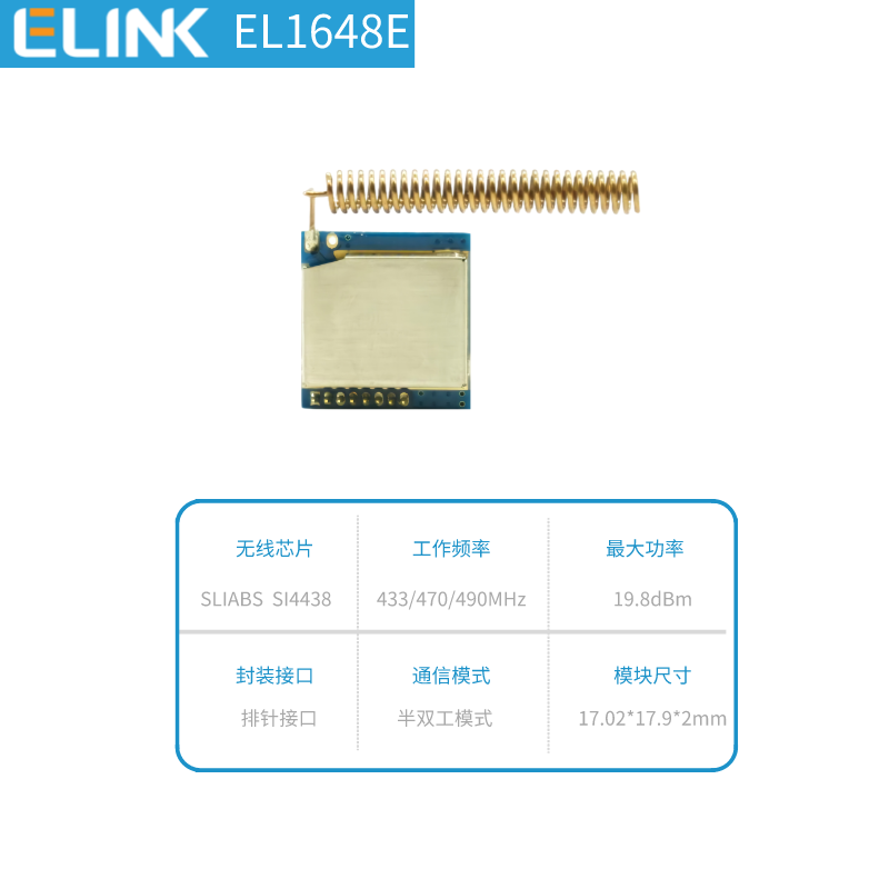 EL1648E是一款采用SI4438內(nèi)核設(shè)計的輸出功率為100mW的高性能無線收發(fā)通訊模組。工作頻段為425MHz~525MHz,默認頻段490MHz。