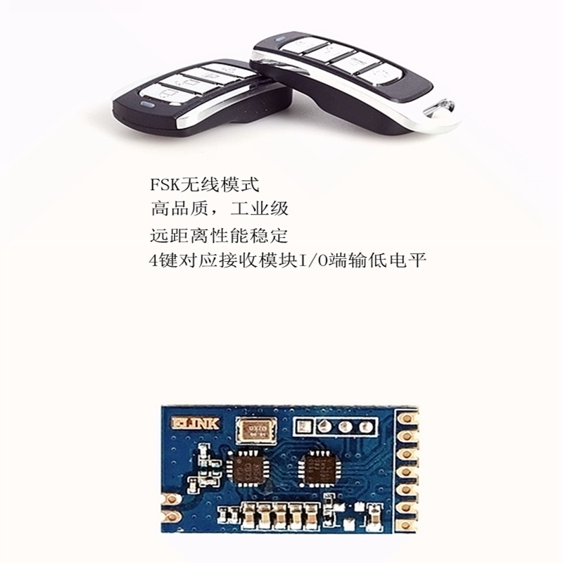 本模塊采用了 Silicon Labs 的 SI4355 作為無(wú)線遙控器接收模組,SI4010作為無(wú)線發(fā)射遙控器模組是一套完整的、體積小巧、低功耗、應(yīng)用簡(jiǎn)單 無(wú)線收發(fā)套件。此套件分為接收模組與無(wú)線模塊,用戶無(wú)須再進(jìn)行開(kāi)發(fā),即可實(shí)現(xiàn)無(wú)線的的接收與發(fā)送。并可實(shí)現(xiàn)發(fā)射模組,接收模組收到相應(yīng)數(shù)據(jù)觸發(fā)對(duì)應(yīng)端口輸出。這是一款目前用途非常廣泛的300米四鍵遙控模塊,常用于報(bào)警器設(shè)防、車(chē)庫(kù)門(mén)遙控、工業(yè)控制、汽車(chē)遙控等,這類(lèi)用途要求遙控器的遙控距離比較遠(yuǎn),可靠性,抗干擾強(qiáng)(50億組不同的地址),非常適合工業(yè)控制應(yīng)用。這是一套高性能低成功的無(wú)線遙控收發(fā)套件。