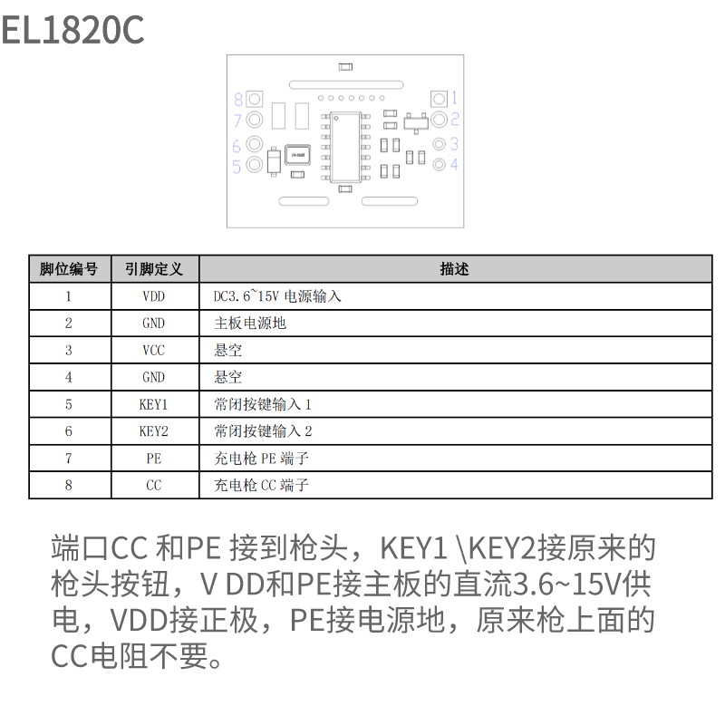 EL1820C 是一款用于新能源車充電槍的無線控制模塊,可解鎖特斯拉車型 的充電蓋板。 EL1820C 可用于解鎖特斯拉電動車的充電蓋板,使用于各種充電設(shè)備,可 選充電功率,無線遙控解鎖充電蓋板。