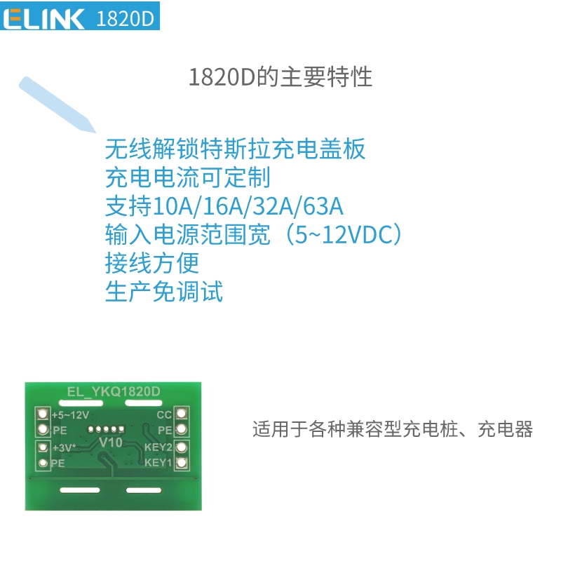 EL_YKQ1820D是一款用于新能源車充電槍的無線控制模塊,可解鎖特斯拉車型的充電蓋板。tesla特斯拉汽車充電口自動開蓋解鎖
